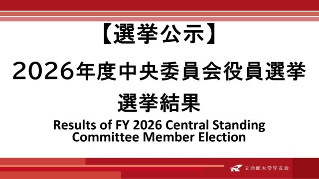 中央委員会 2026年度中央委員会役員選挙 結果公示 2025年12月1日 中央事務局 https://www.ritsumei.club/wp-content/uploads/2024/12/5aa6463c7e04a8f54e8950ff3b6b58bb.png 立命館大学学友会
