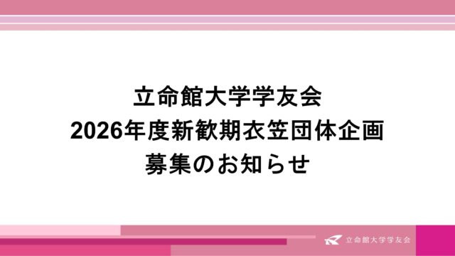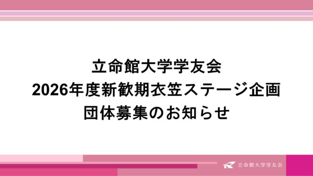 全学行事 2026年度新歓期衣笠団体企画 2026年2月16日 立命館大学学友会 https://www.ritsumei.club/wp-content/uploads/2024/12/5aa6463c7e04a8f54e8950ff3b6b58bb.png 立命館大学学友会