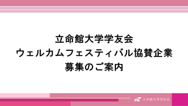 全学行事 ウェルカムフェスティバル協賛企業募集のご案内 2026年2月20日 立命館大学学友会 https://www.ritsumei.club/wp-content/uploads/2024/12/5aa6463c7e04a8f54e8950ff3b6b58bb.png 立命館大学学友会