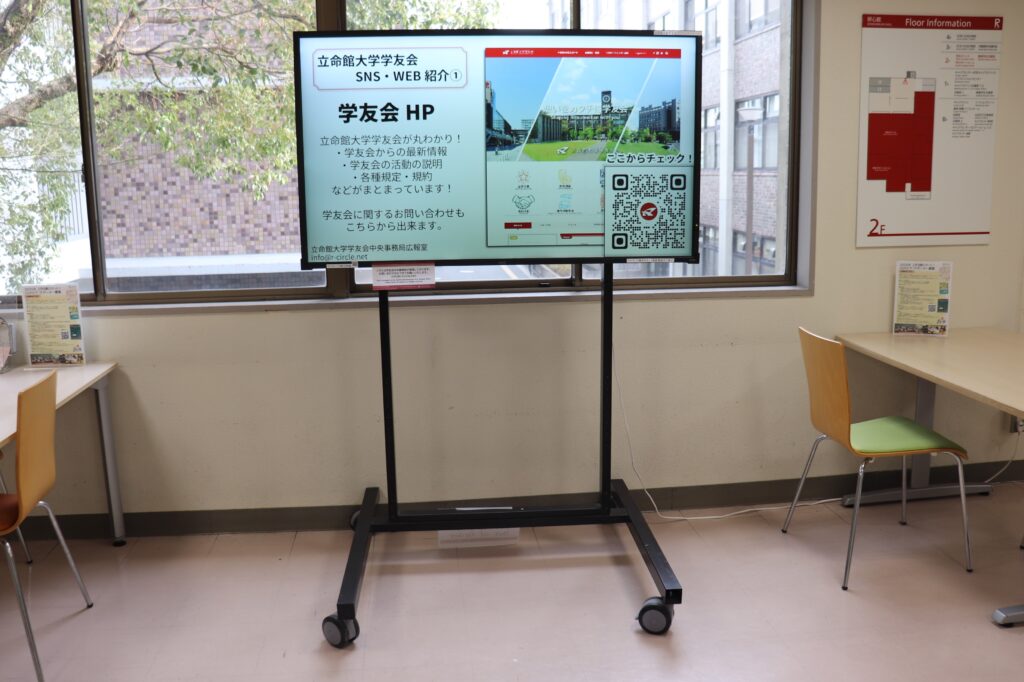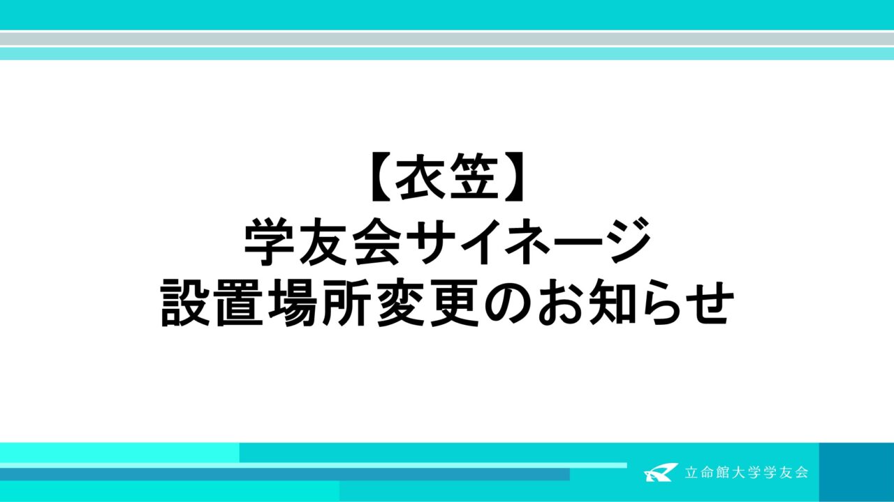 サポート 【衣笠】学友会サイネージ設置場所変更のお知らせ 中央事務局 2026年1月20日 衣笠キャンパス設置の学友会サイネージについて、人流や稼働状況等を総合的に鑑みた上で設置場所を以下の通り変更いたしましたのでお知らせ致します。 なお、それに伴い、学生会館1階ゆんげ内、諒友館食堂内のサイネージは撤去されました。 研心館2階 学生オフィス前 敬学館1階 サイネージの詳細や投稿はこちらからお願い致します。