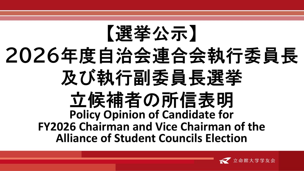 学友会中央選挙管理委員会より、2026年2月6日に公示した2026年度自治会連合会執行委員長及び執行副委員長選挙の立候補者の所信表明を公表いたします。