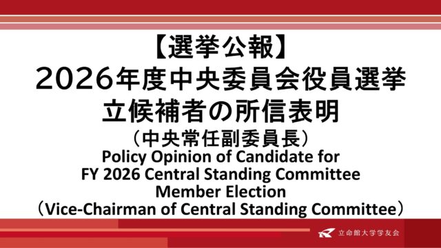 中央委員会 2026年度中央委員会役員選挙 立候補者に関する選挙公報(中央常任副委員長所信表明) 2025年12月12日 中央事務局 https://www.ritsumei.club/wp-content/uploads/2024/12/5aa6463c7e04a8f54e8950ff3b6b58bb.png 立命館大学学友会